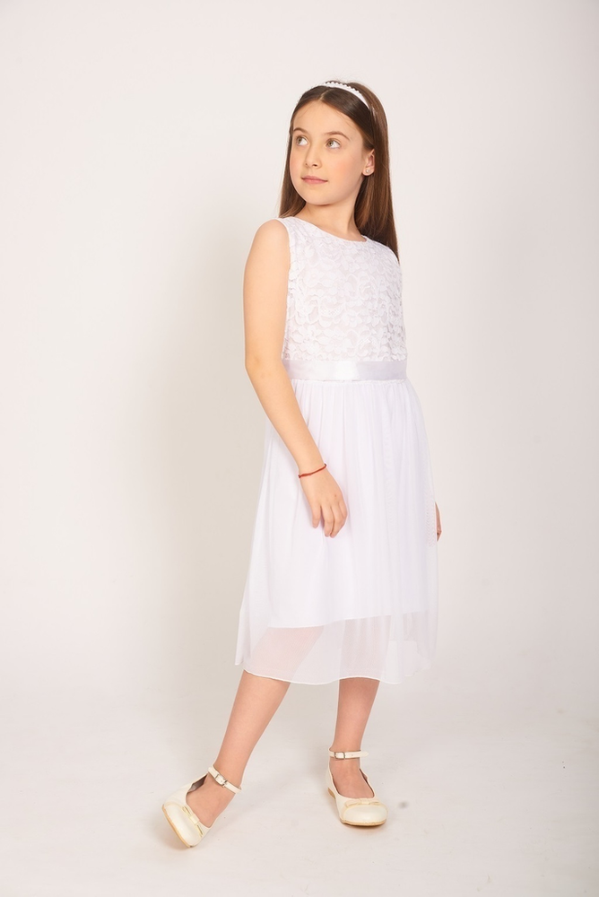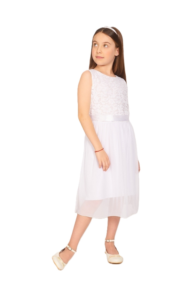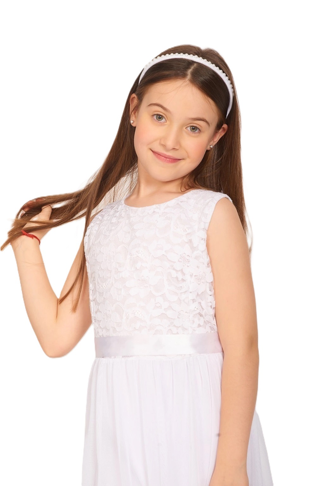 Este encantador vestido presenta un exquisito encaje de flores y tul, ideal para ocasiones especiales. Su forrería de algodón garantiza comodidad y frescura, mientras que el lazo para la cintura resalta la figura.