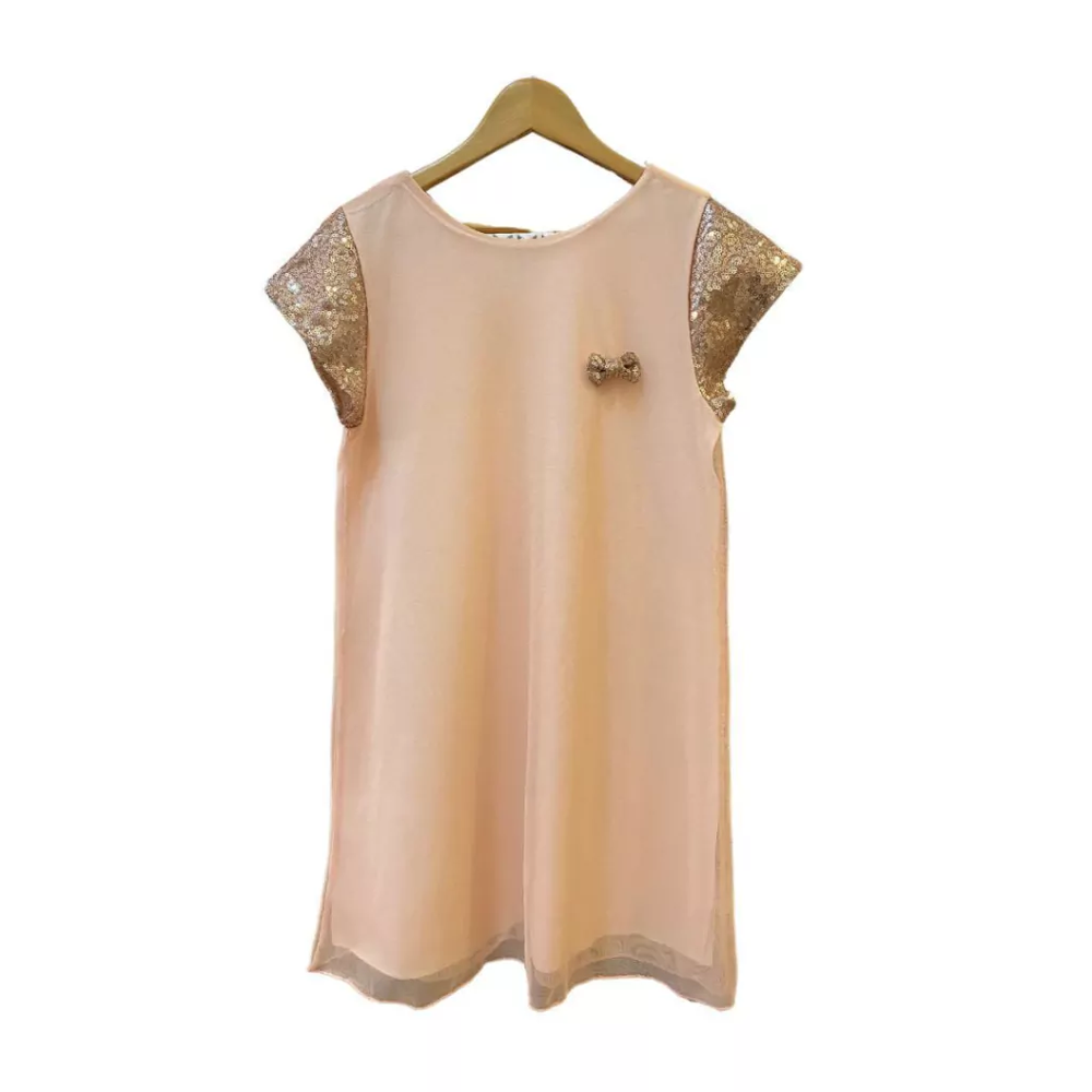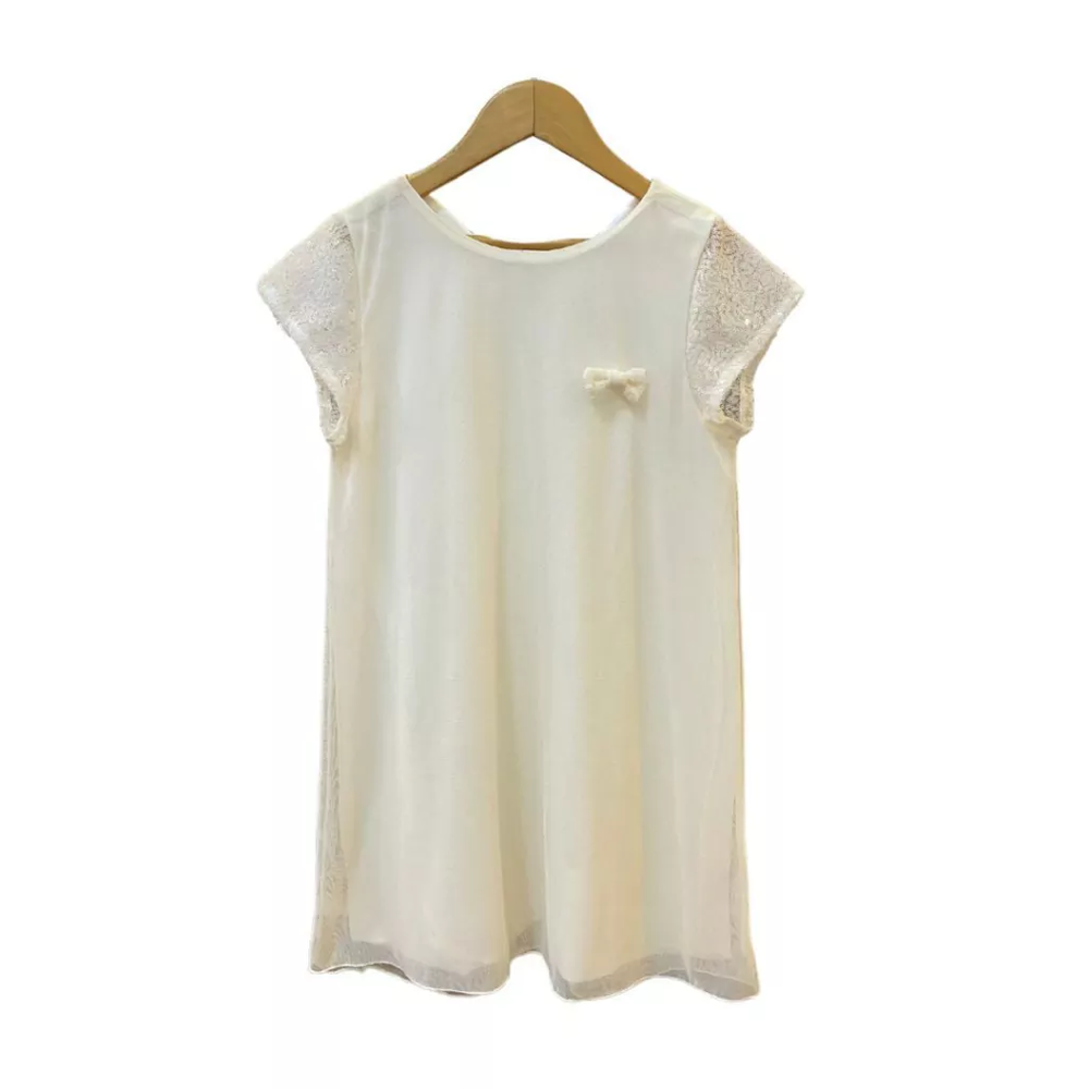 Vestido de Algodon y tul. con mangas de lentejuelas y aplique de moño.
